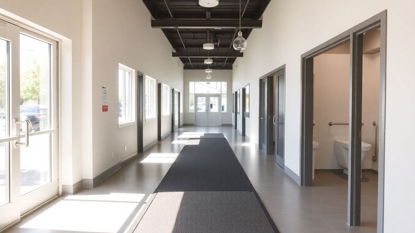 Accessible commercial space interior with ramp and wide doorways.
