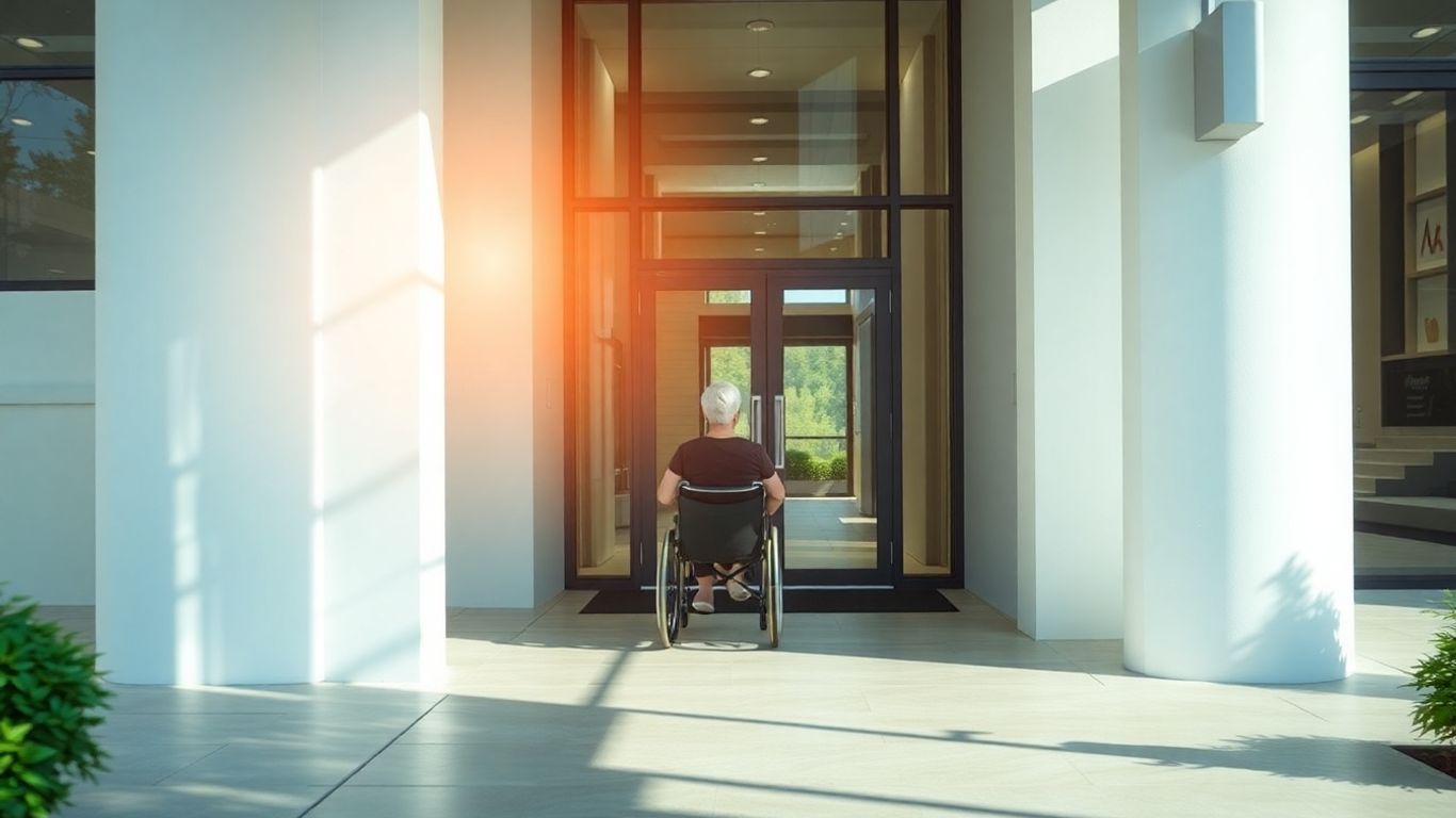 Accessible commercial building entrance with a wheelchair user.