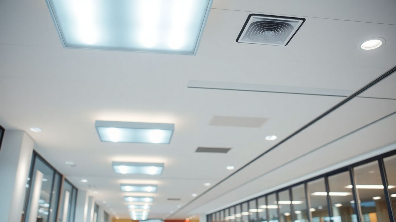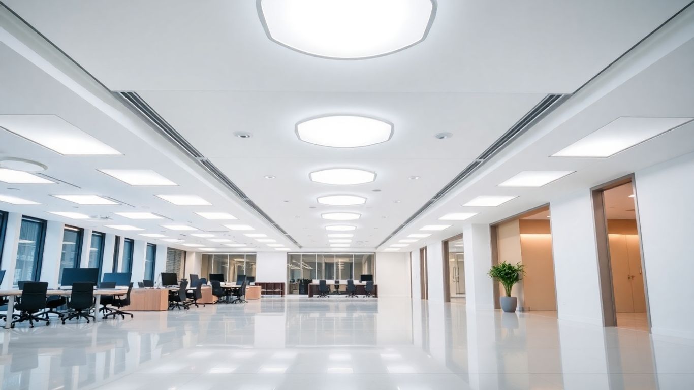 Modern office interior with bright LED lighting.